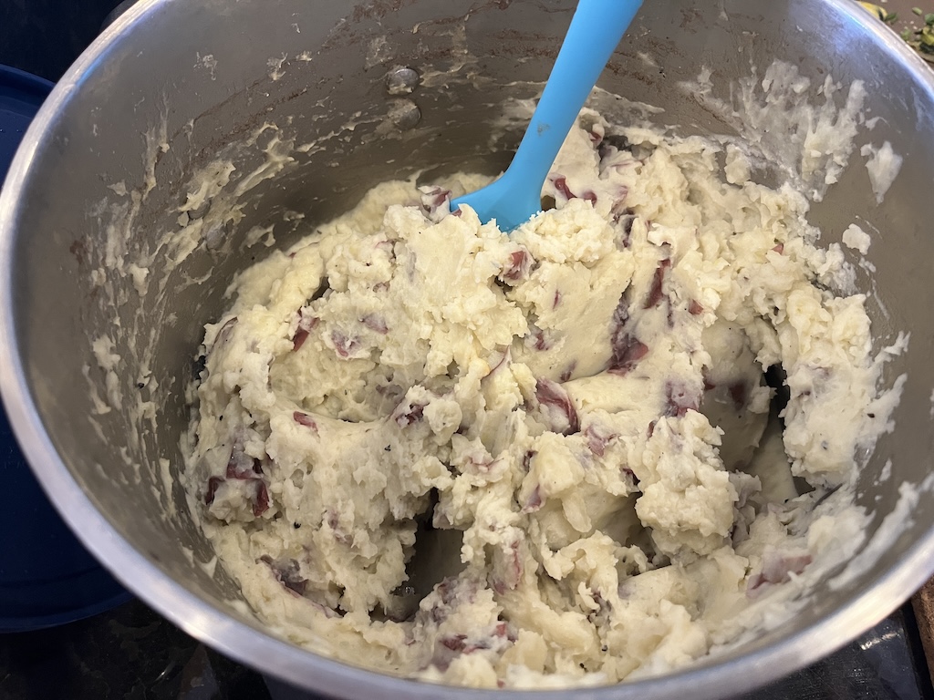 - Using a potato masher or electric beater, slowly blend milk mixture into potatoes until smooth and creamy.
